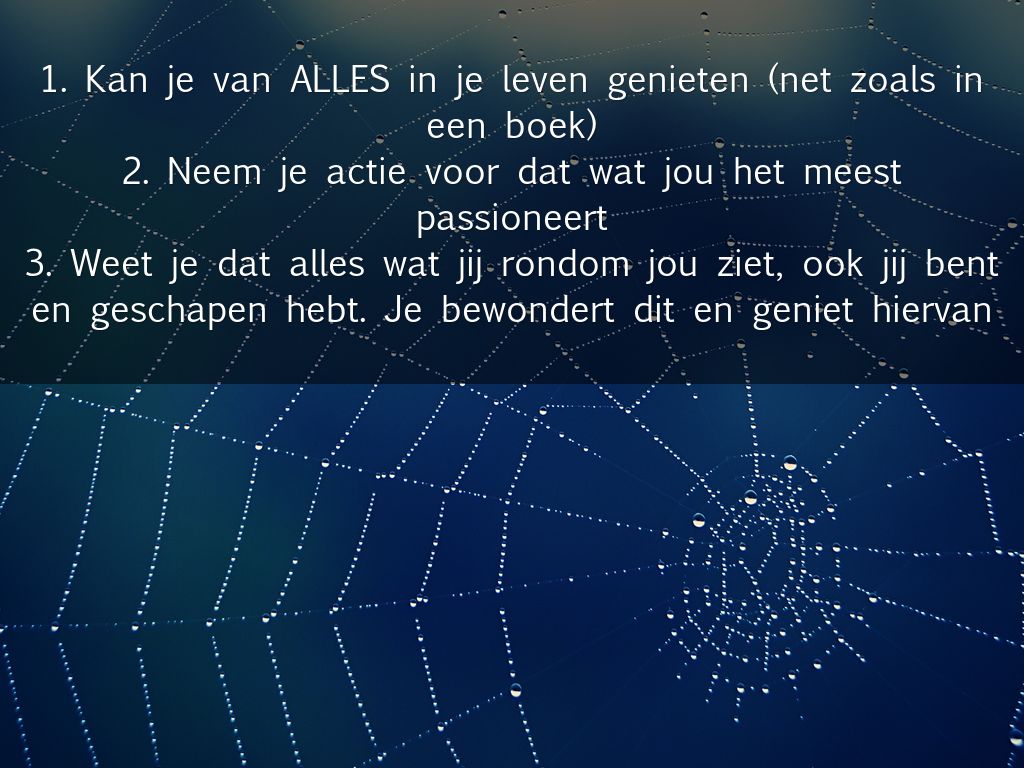 1. Kan je van ALLES in je leven genieten (net zoals in een boek) 2. Neem je actie voor dat wat jou het meest passioneert 3. Weet je dat alles wat jij rondom jou ziet, ook jij bent en geschapen hebt. Je bewondert dit en geniet hiervan