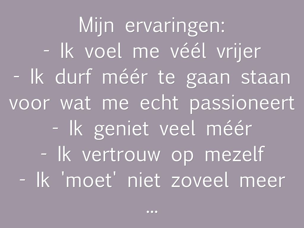 Mijn ervaringen: - Ik voel me véél vrijer - Ik durf méér te gaan staan voor wat me echt passioneert - Ik geniet veel méér - Ik vertrouw op mezelf - Ik 'moet' niet zoveel meer ...
