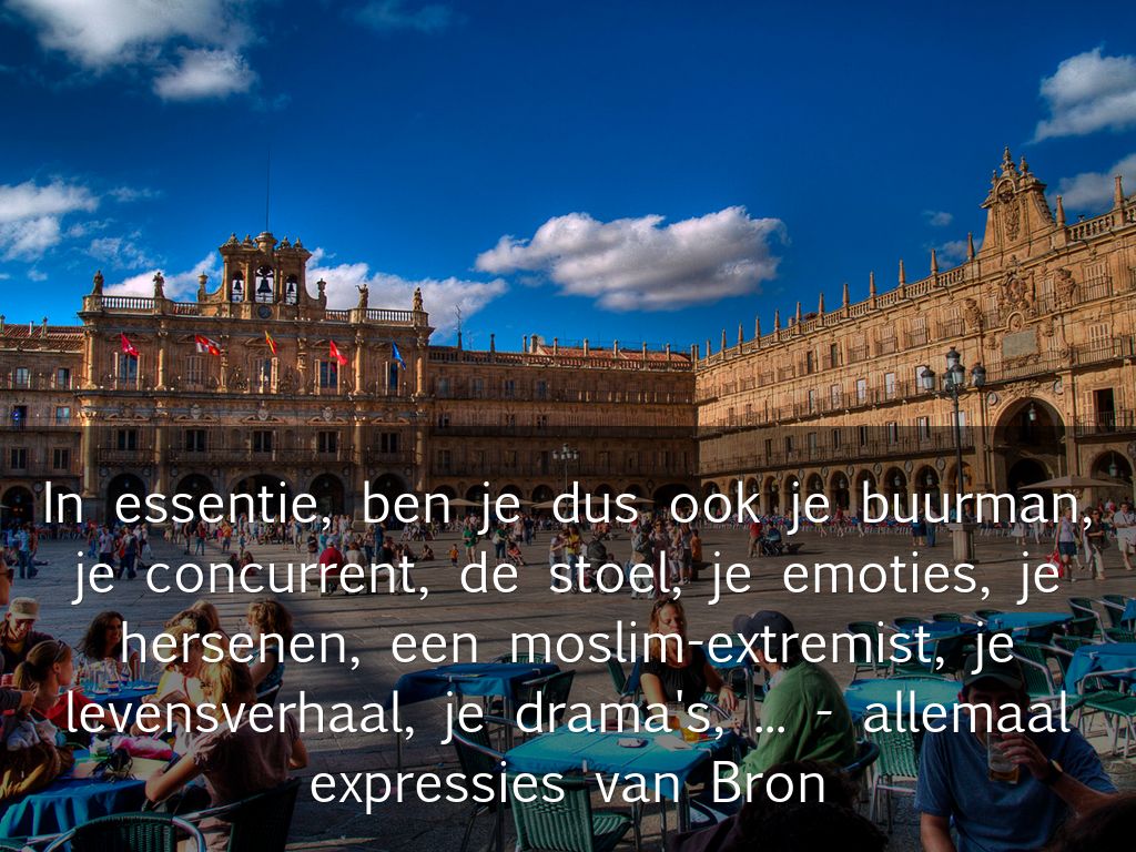 In essentie, ben je dus ook je buurman, je concurrent, de stoel, je emoties, je hersenen, een moslim-extremist, je levensverhaal, je drama's, ... - allemaal expressies van Bron