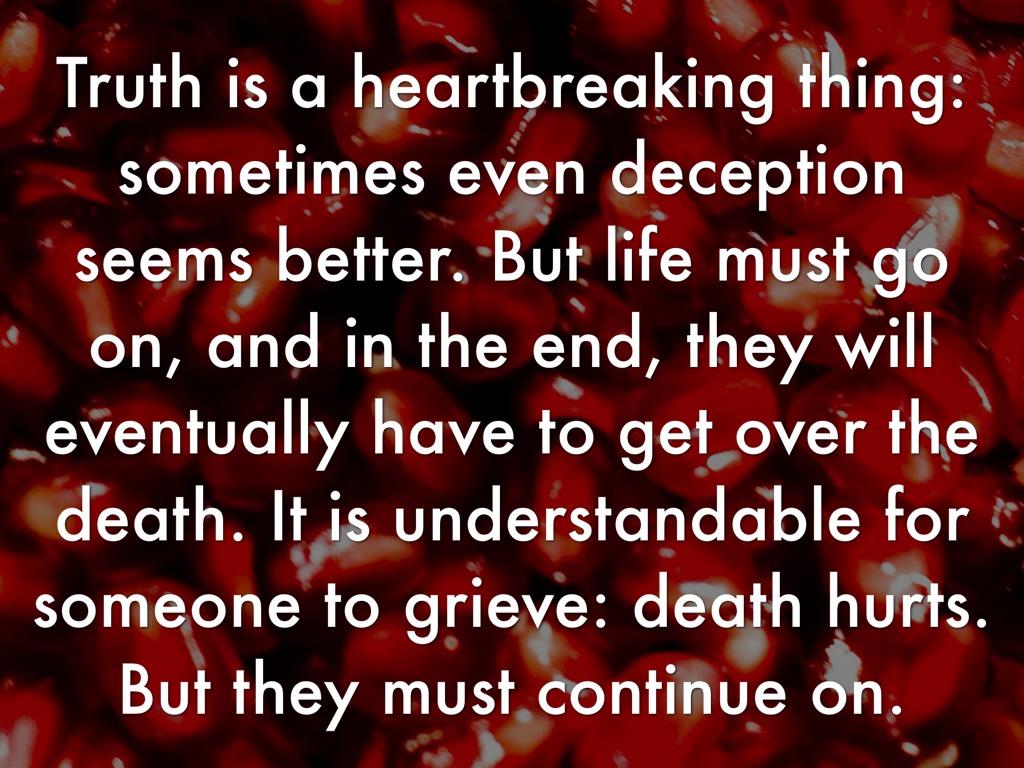 Truth is a heartbreaking thing: sometimes even deception seems better. But life must go on, and in the end, they will eventually have to get over the death. It is understandable for someone to grieve: death hurts. But they must continue on.