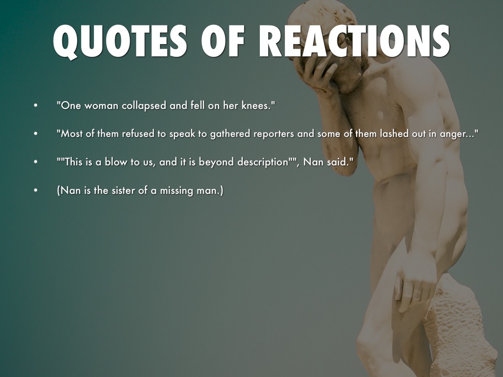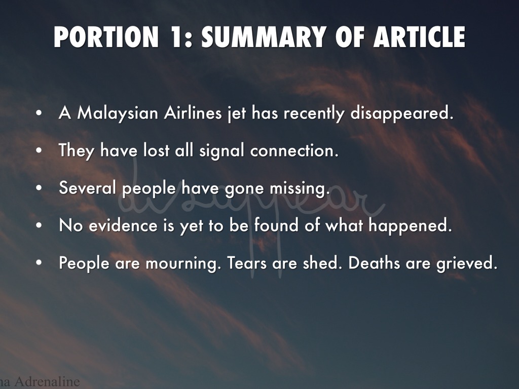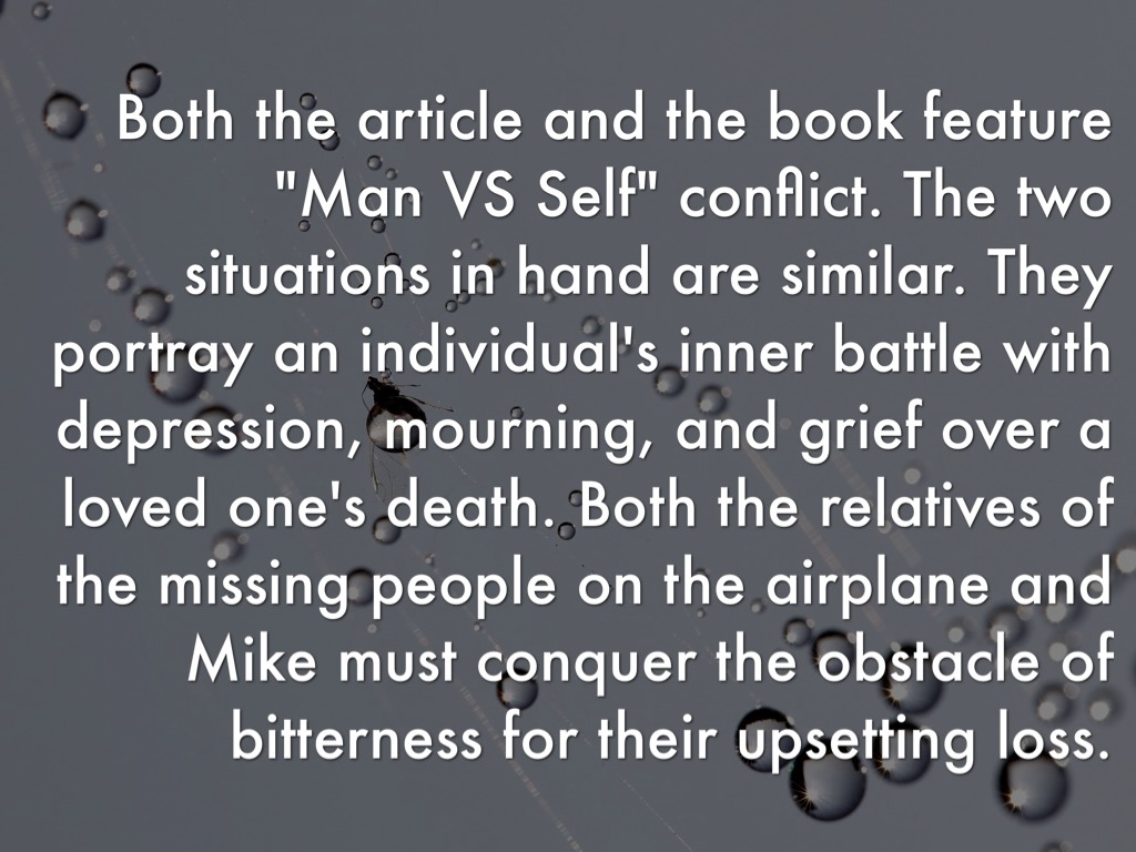 Both the article and the book feature "Man VS Self" conflict. The two situations in hand are similar. They portray an individual's inner battle with depression, mourning, and grief over a loved one's death. Both the relatives of the missing people on the airplane and Mike must conquer the obstacle of bitterness for their upsetting loss.
