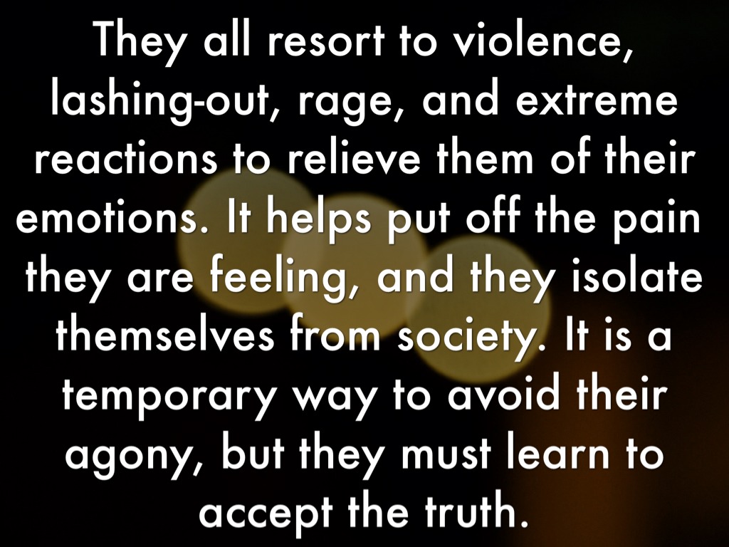 They all resort to violence, lashing-out, rage, and extreme reactions to relieve them of their emotions. It helps put off the pain they are feeling, and they isolate themselves from society. It is a temporary way to avoid their agony, but they must learn to accept the truth.