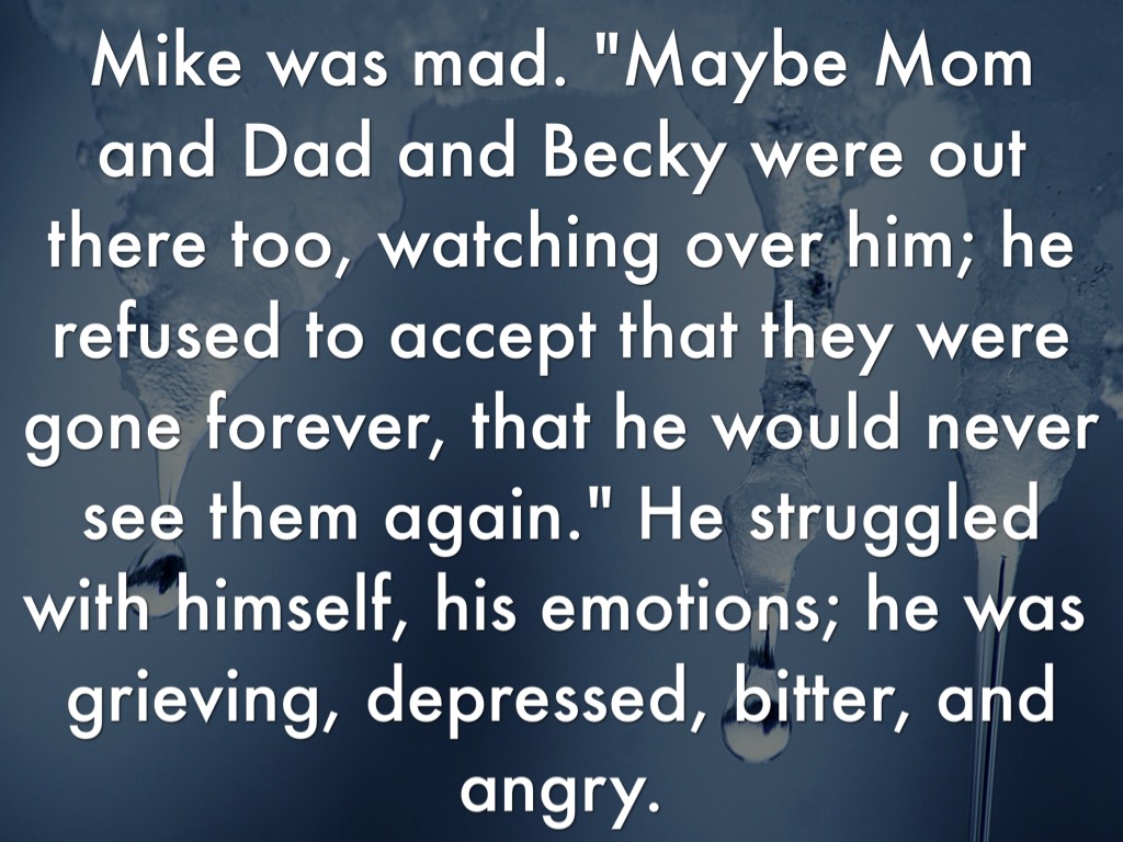 Mike was mad. "Maybe Mom and Dad and Becky were out there too, watching over him; he refused to accept that they were gone forever, that he would never see them again." He struggled with himself, his emotions; he was grieving, depressed, bitter, and angry.