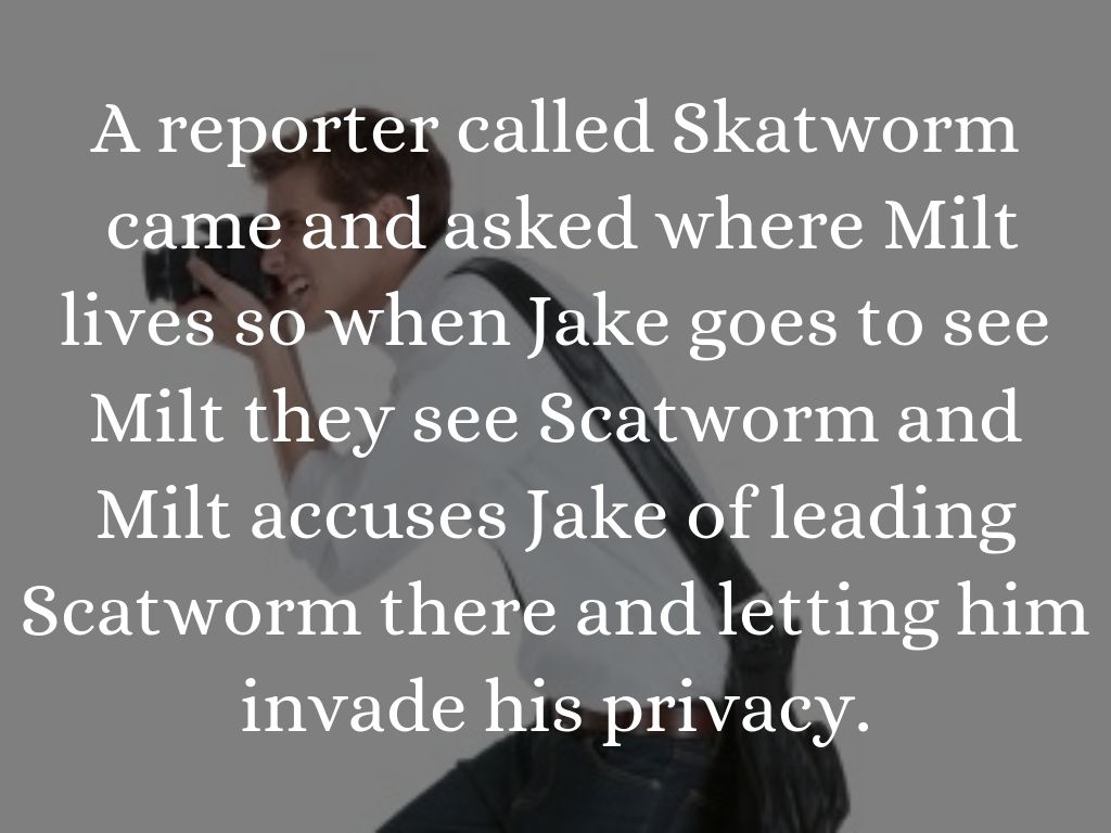 A reporter called Skatworm came and asked where Milt lives so when Jake goes to see Milt they see Scatworm and Milt accuses Jake of leading Scatworm there and letting him invade his privacy.