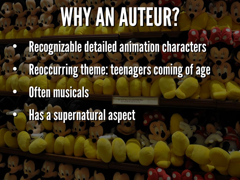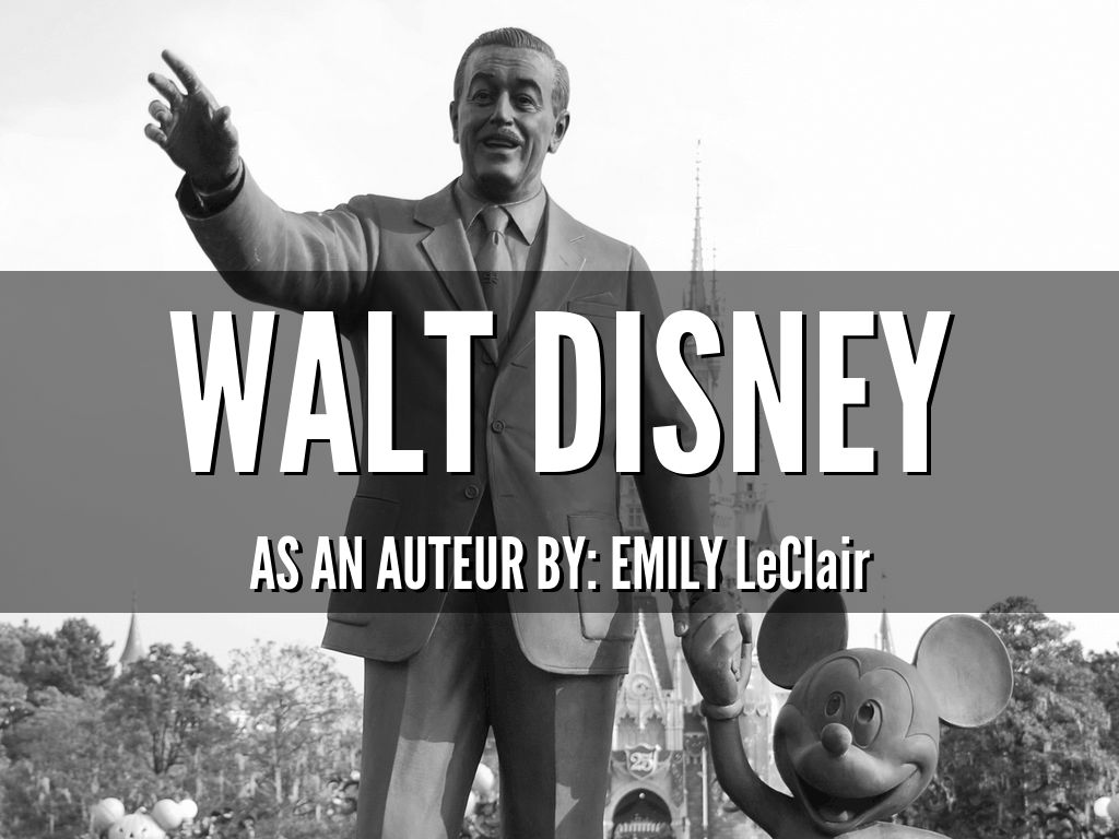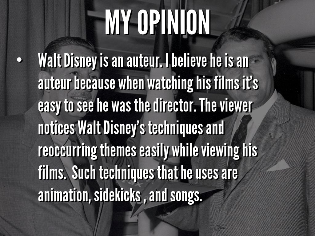 Walt Disney is an auteur. I believe he is an auteur because when watching his films it's easy to see he was the director. The viewer notices Walt Disney's techniques and reoccurring themes easily while viewing his films. Such techniques that he uses are animation, sidekicks , and songs.