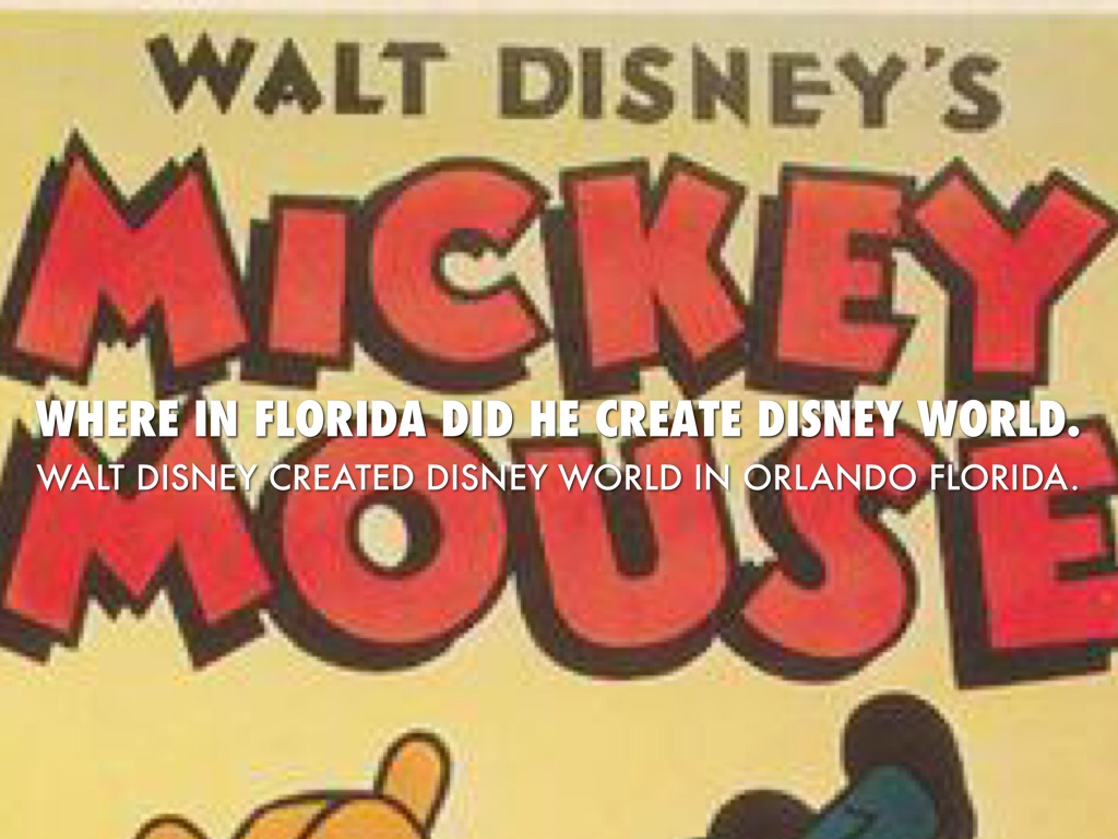 WALT DISNEY CREATED DISNEY WORLD IN ORLANDO FLORIDA.