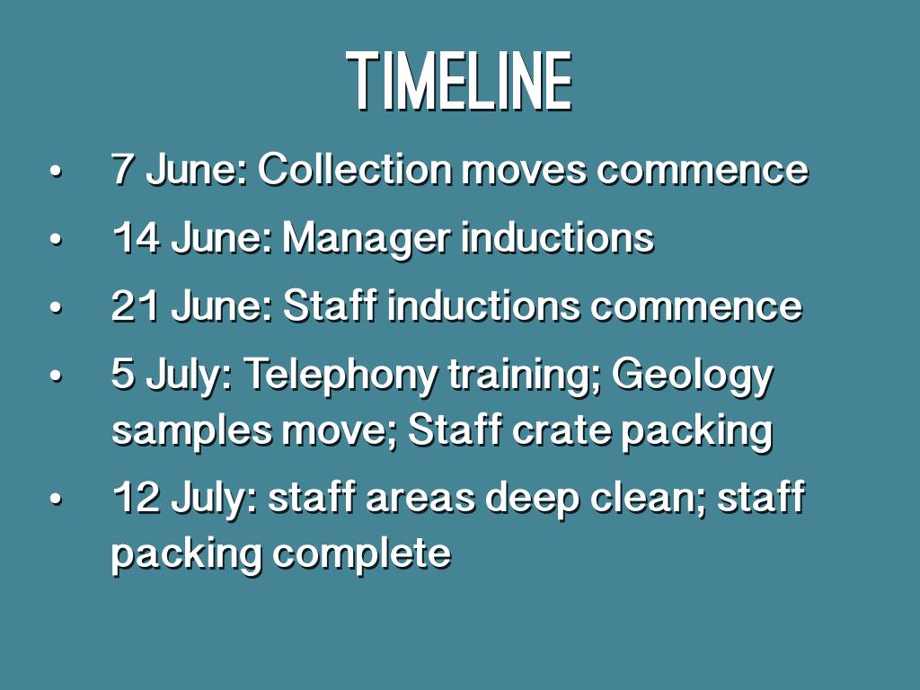 5 July: Telephony training; Geology samples move; Staff crate packing