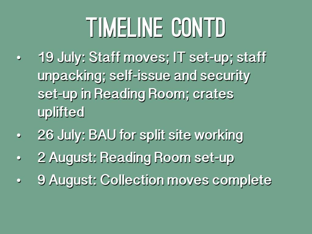 19 July: Staff moves; IT set-up; staff unpacking; self-issue and security set-up in Reading Room; crates uplifted