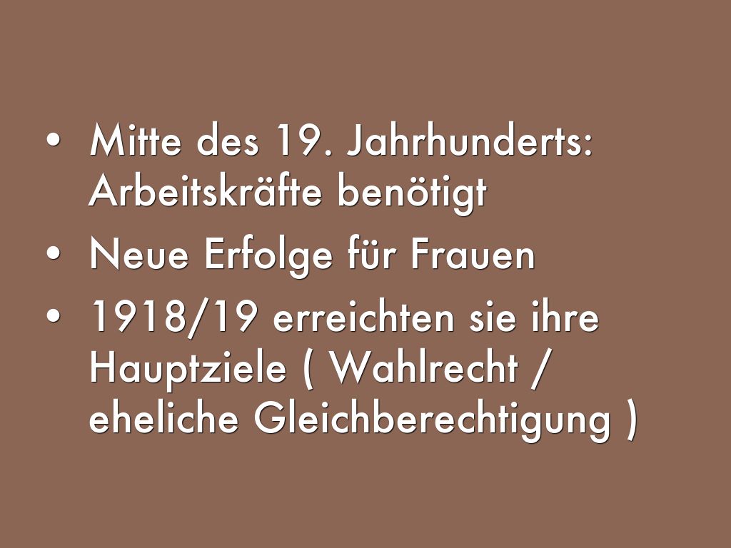 1918/19 erreichten sie ihre Hauptziele ( Wahlrecht / eheliche Gleichberechtigung )