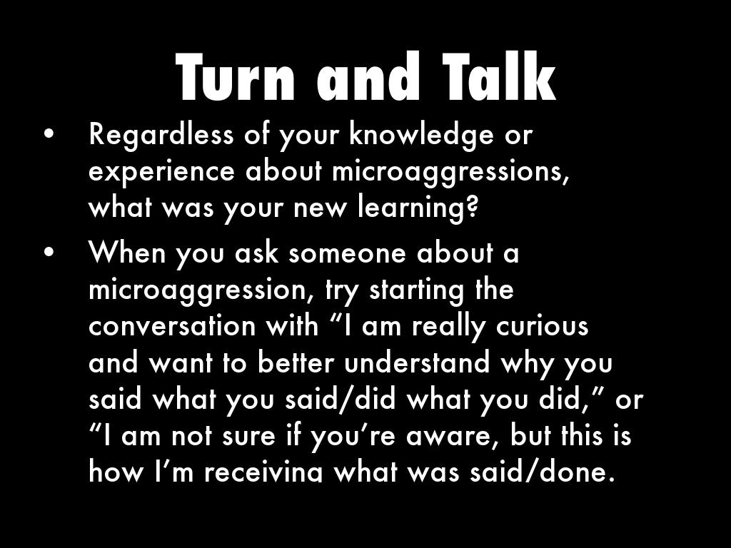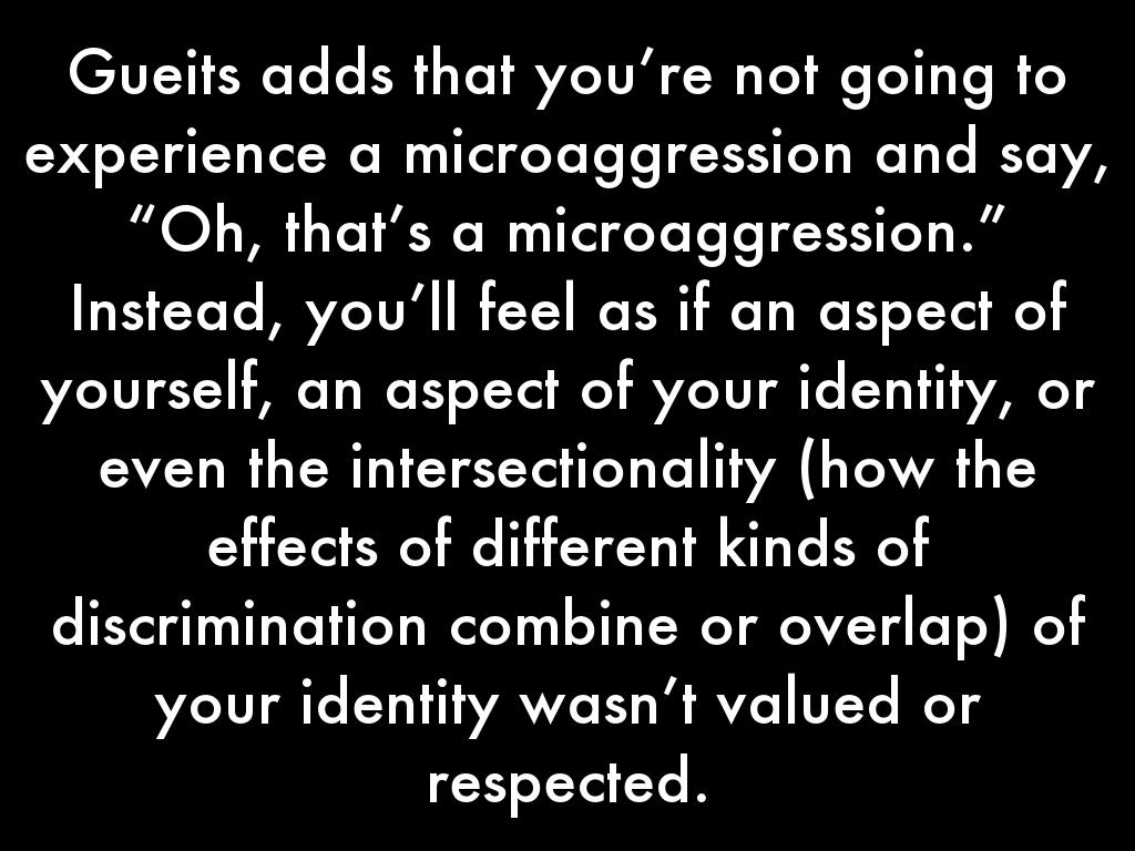 Gueits adds that you’re not going to experience a microaggression and say, “Oh, that’s a microaggression.” Instead, you’ll feel as if an aspect of yourself, an aspect of your identity, or even the intersectionality (how the effects of different kinds of discrimination combine or overlap) of your identity wasn’t valued or respected.