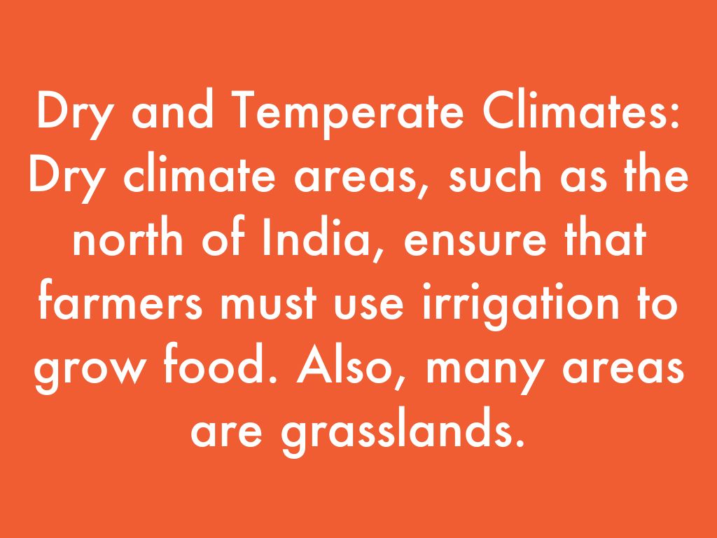 Dry climate areas, such as the north of India, ensure that farmers must use irrigation to grow food. Also, many areas are grasslands.