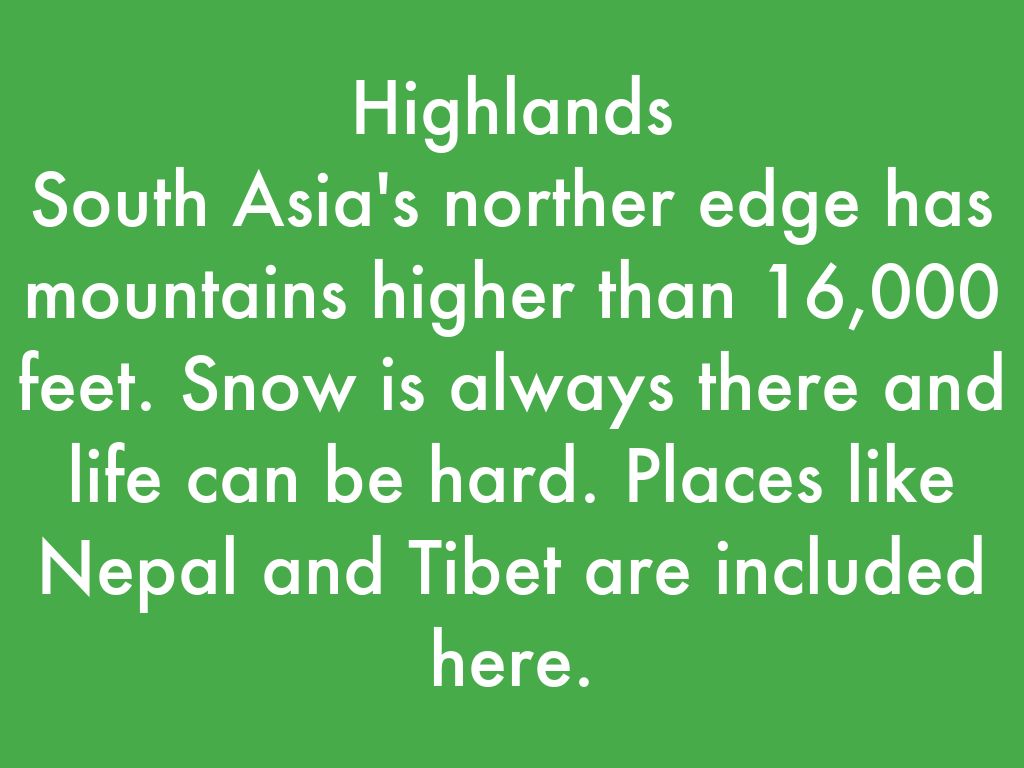 South Asia's norther edge has mountains higher than 16,000 feet. Snow is always there and life can be hard. Places like Nepal and Tibet are included here.