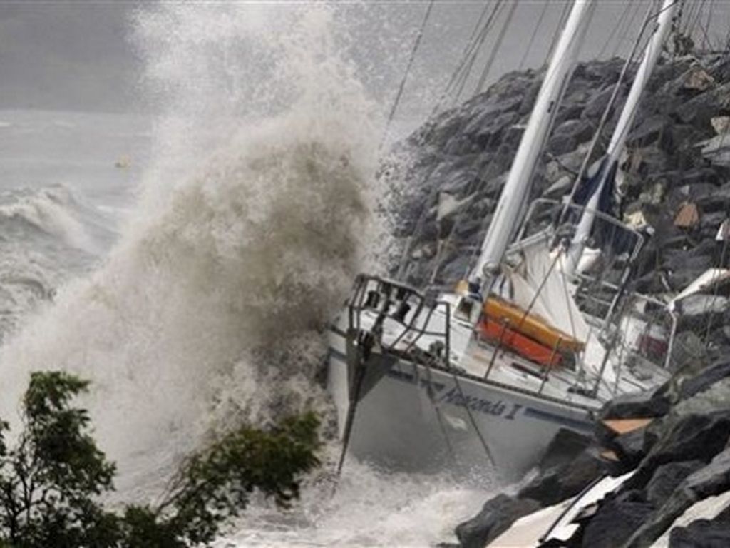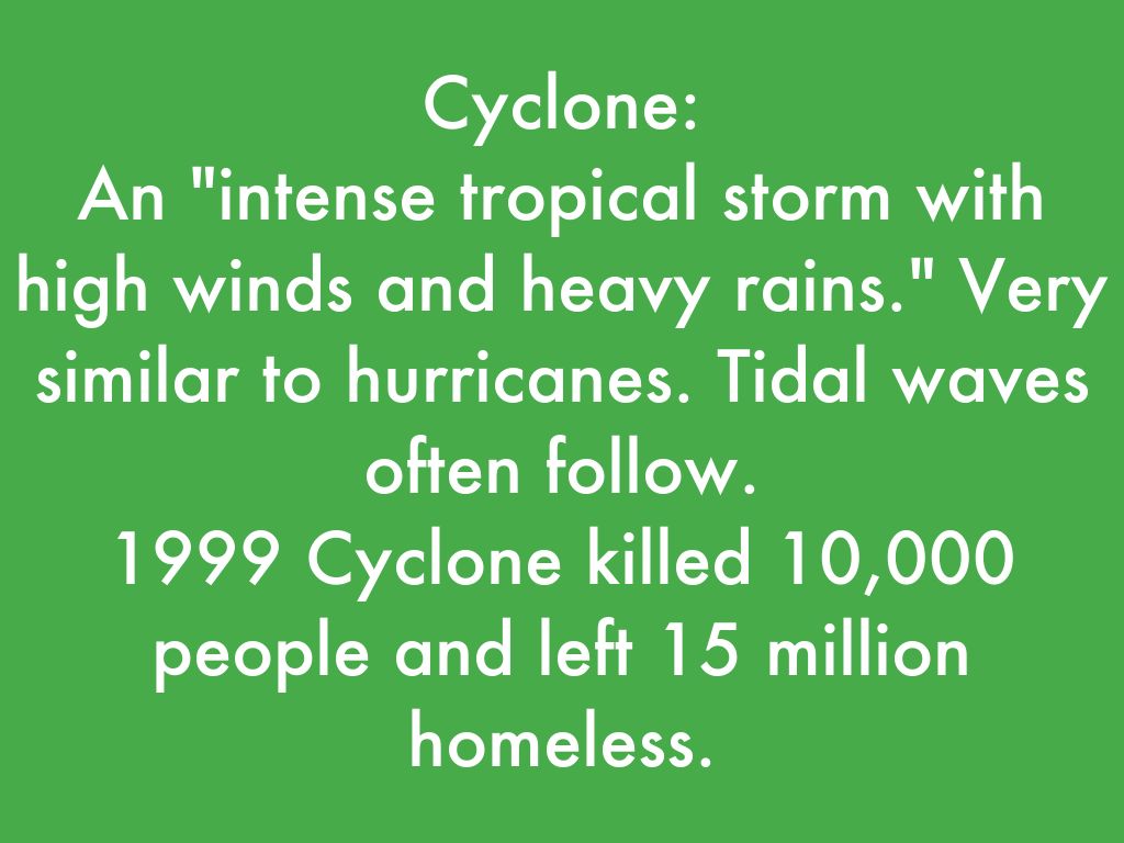 An "intense tropical storm with high winds and heavy rains." Very similar to hurricanes. Tidal waves often follow.