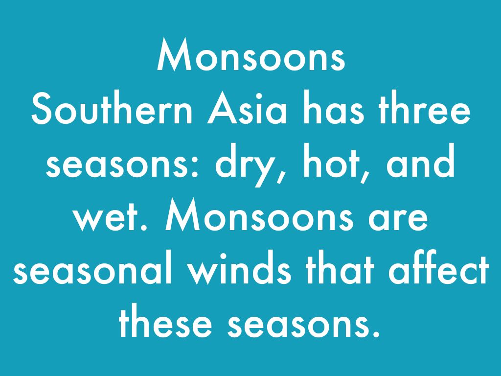 Southern Asia has three seasons: dry, hot, and wet. Monsoons are seasonal winds that affect these seasons.