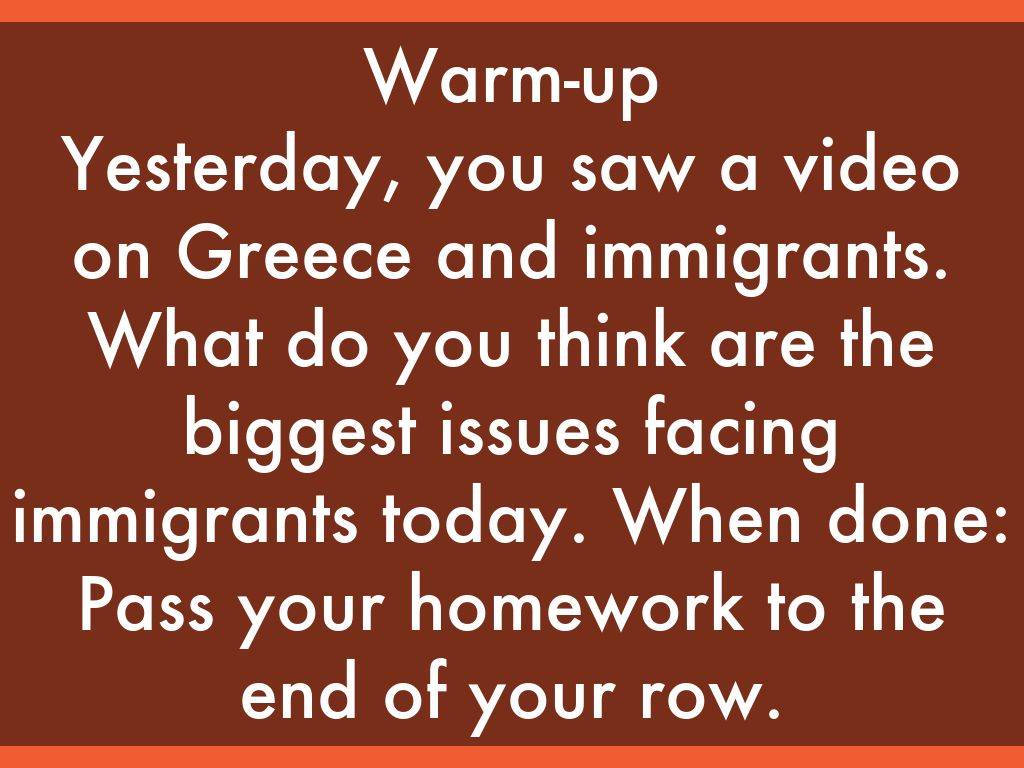 Warm-up Yesterday, you saw a video on Greece and immigrants. What do you think are the biggest issues facing immigrants today. When done: Pass your homework to the end of your row.