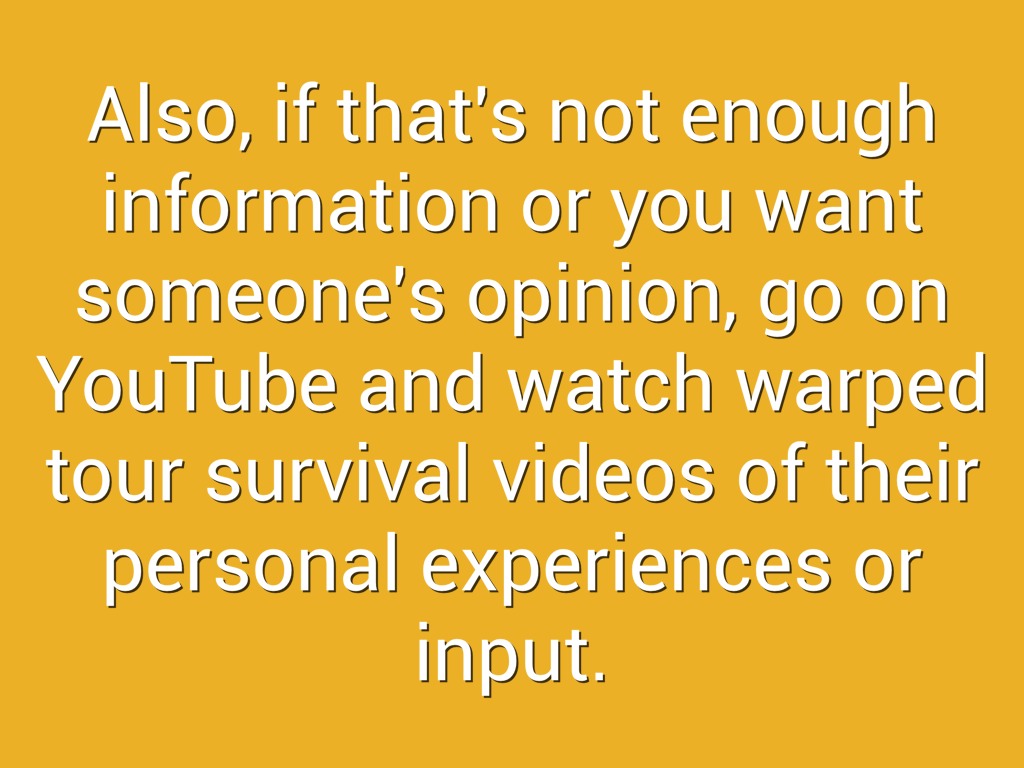 Also, if that's not enough information or you want someone's opinion, go on YouTube and watch warped tour survival videos of their personal experiences or input.