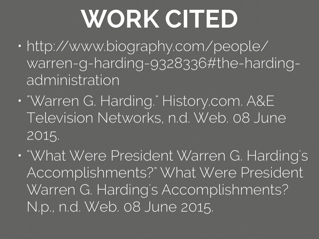 "What Were President Warren G. Harding's Accomplishments?" What Were President Warren G. Harding's Accomplishments? N.p., n.d. Web. 08 June 2015.