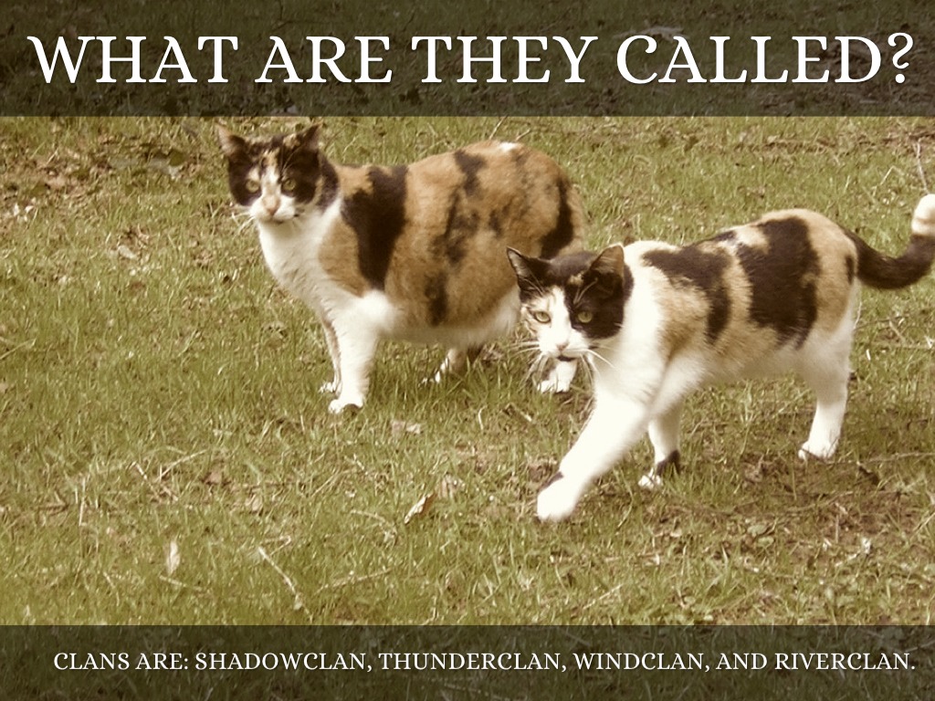 CLANS ARE: SHADOWCLAN, THUNDERCLAN, WINDCLAN, AND RIVERCLAN.