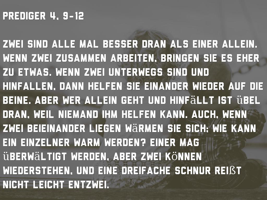 Zwei sind alle Mal besser dran als einer allein. Wenn zwei zusammen arbeiten, bringen sie es eher zu etwas. Wenn Zwei unterwegs sind und hinfallen, dann helfen sie einander wieder auf die Beine. Aber wer allein geht und hinfällt ist übel dran, weil niemand ihm helfen kann. Auch, wenn zwei beieinander liegen wärmen sie sich; Wie kann ein einzelner warm werden? Einer mag überwältigt werden, aber zwei können wiederstehen, und eine dreifache Schnur reißt nicht leicht entzwei.