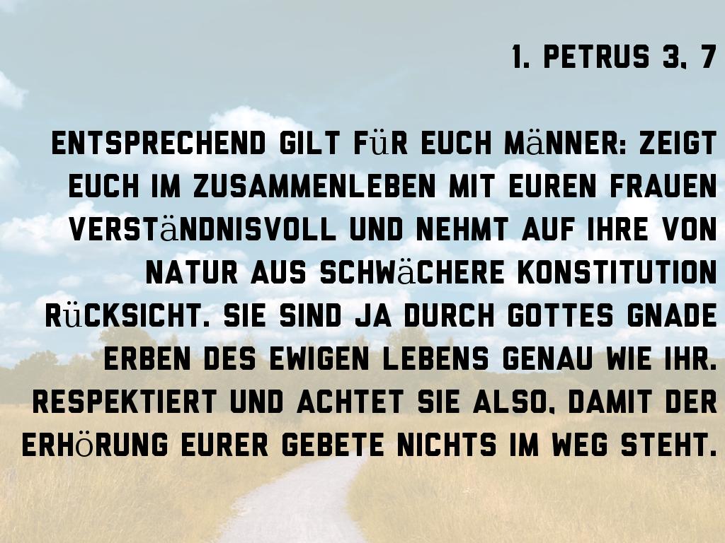 Entsprechend gilt für euch Männer: Zeigt euch im Zusammenleben mit euren Frauen verständnisvoll und nehmt auf ihre von Natur aus schwächere Konstitution Rücksicht. Sie sind ja durch Gottes Gnade Erben des ewigen Lebens genau wie ihr. Respektiert und achtet sie also, damit der Erhörung eurer Gebete nichts im Weg steht.