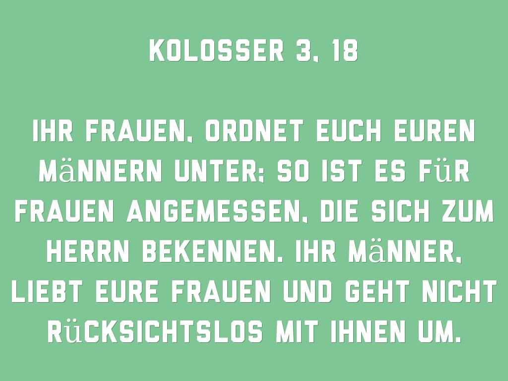 Ihr Frauen, ordnet euch euren Männern unter; so ist es für Frauen angemessen, die sich zum Herrn bekennen. Ihr Männer, liebt eure Frauen und geht nicht rücksichtslos mit ihnen um.