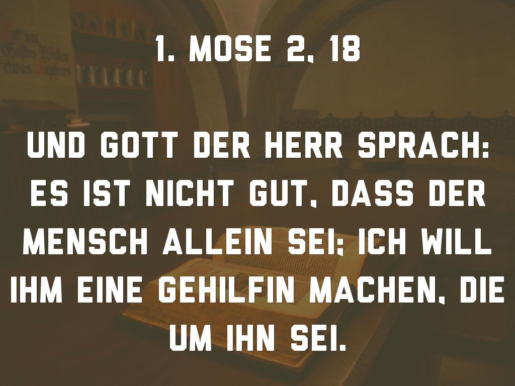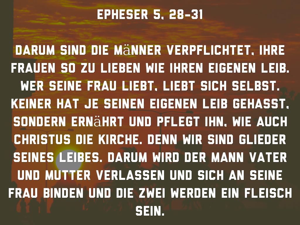 Darum sind die Männer verpflichtet, ihre Frauen so zu lieben wie ihren eigenen Leib. Wer seine Frau liebt, liebt sich selbst. Keiner hat je seinen eigenen Leib gehasst, sondern ernährt und pflegt ihn, wie auch Christus die Kirche. Denn wir sind Glieder seines Leibes. Darum wird der Mann Vater und Mutter verlassen und sich an seine Frau binden und die zwei werden ein Fleisch sein.