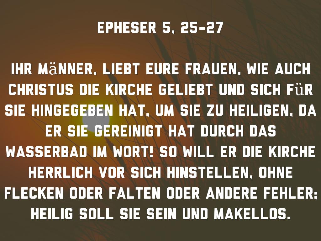 Ihr Männer, liebt eure Frauen, wie auch Christus die Kirche geliebt und sich für sie hingegeben hat, um sie zu heiligen, da er sie gereinigt hat durch das Wasserbad im Wort! So will er die Kirche herrlich vor sich hinstellen, ohne Flecken oder Falten oder andere Fehler; heilig soll sie sein und makellos.