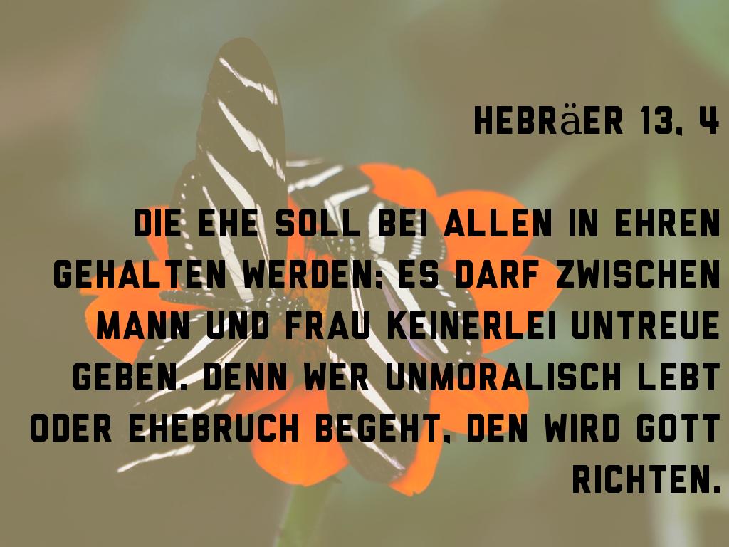 Die Ehe soll bei allen in Ehren gehalten werden; es darf zwischen Mann und Frau keinerlei Untreue geben. Denn wer unmoralisch lebt oder Ehebruch begeht, den wird Gott richten.