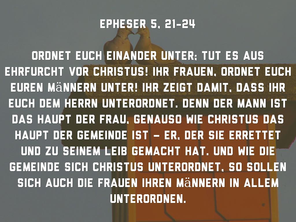 Ordnet euch einander unter; tut es aus Ehrfurcht vor Christus! Ihr Frauen, ordnet euch euren Männern unter! Ihr zeigt damit, dass ihr euch dem Herrn unterordnet. Denn der Mann ist das Haupt der Frau, genauso wie Christus das Haupt der Gemeinde ist – er, der sie errettet und zu seinem Leib gemacht hat. Und wie die Gemeinde sich Christus unterordnet, so sollen sich auch die Frauen ihren Männern in allem unterordnen.