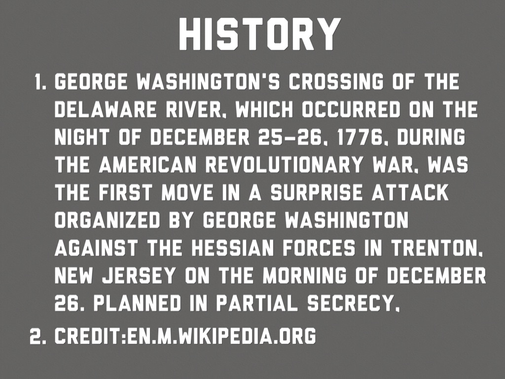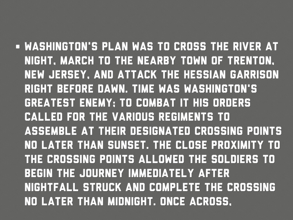 Washington's plan was to cross the river at night, march to the nearby town of Trenton, New Jersey, and attack the Hessian garrison right before dawn. Time was Washington's greatest enemy; to combat it his orders called for the various regiments to assemble at their designated crossing points no later than sunset. The close proximity to the crossing points allowed the soldiers to begin the journey immediately after nightfall struck and complete the crossing no later than midnight. Once across,