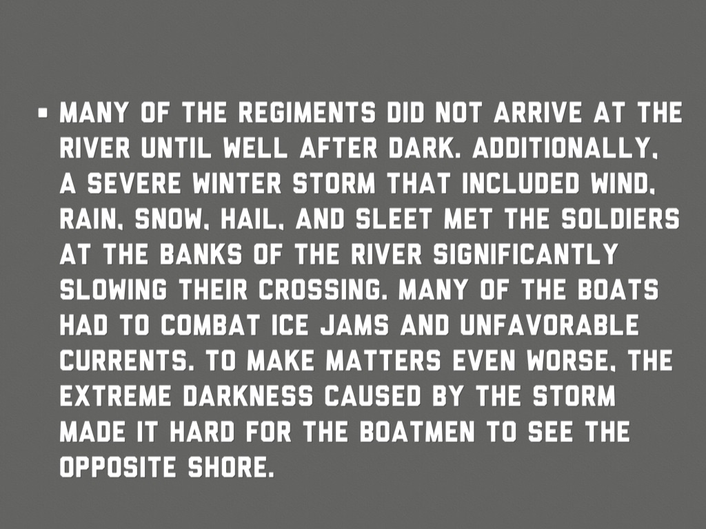 Many of the regiments did not arrive at the river until well after dark. Additionally, a severe winter storm that included wind, rain, snow, hail, and sleet met the soldiers at the banks of the river significantly slowing their crossing. Many of the boats had to combat ice jams and unfavorable currents. To make matters even worse, the extreme darkness caused by the storm made it hard for the boatmen to see the opposite shore.