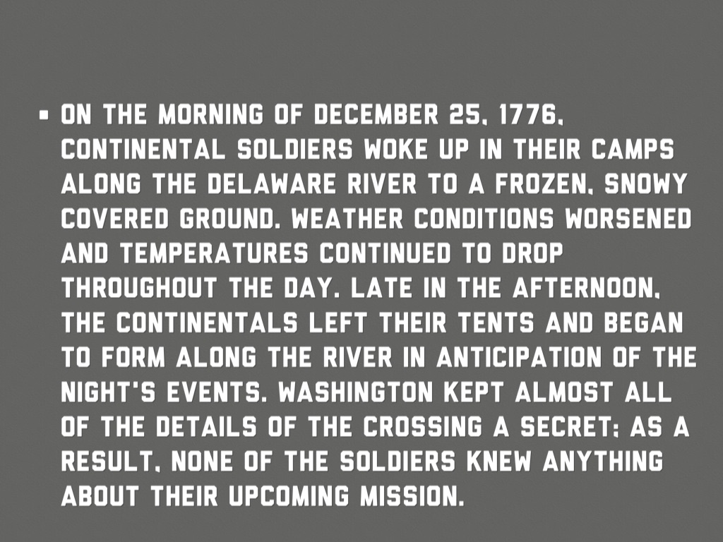 On the morning of December 25, 1776, Continental soldiers woke up in their camps along the Delaware River to a frozen, snowy covered ground. Weather conditions worsened and temperatures continued to drop throughout the day. Late in the afternoon, the Continentals left their tents and began to form along the river in anticipation of the night's events. Washington kept almost all of the details of the crossing a secret; as a result, none of the soldiers knew anything about their upcoming mission.