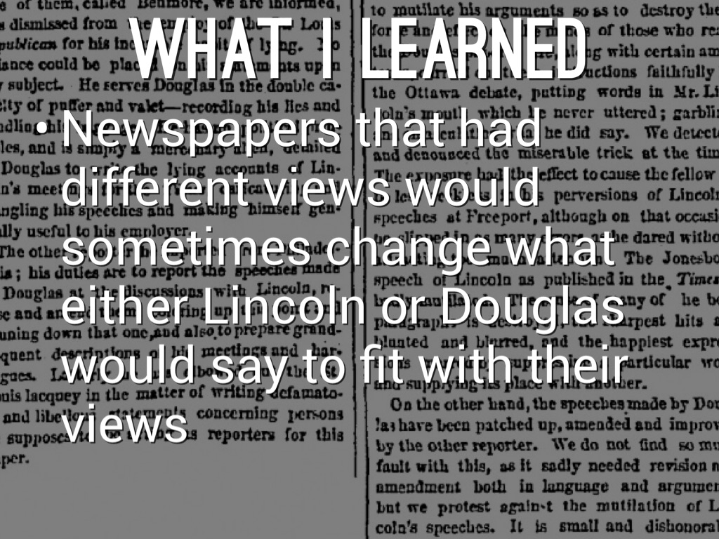 • Newspapers that had different views would sometimes change what either Lincoln or Douglas would say to fit with their views