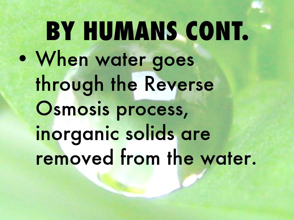 When water goes through the Reverse Osmosis process, inorganic solids are removed from the water.
