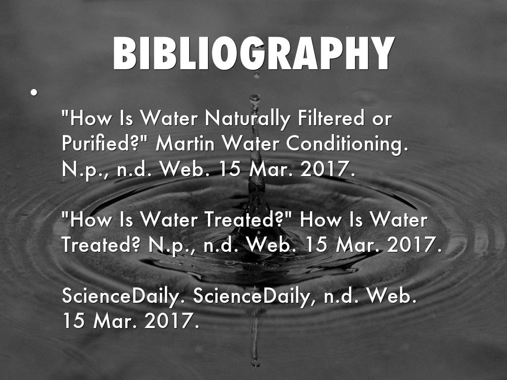 "How Is Water Naturally Filtered or Purified?" Martin Water Conditioning. N.p., n.d. Web. 15 Mar. 2017. "How Is Water Treated?" How Is Water Treated? N.p., n.d. Web. 15 Mar. 2017. ScienceDaily. ScienceDaily, n.d. Web. 15 Mar. 2017.