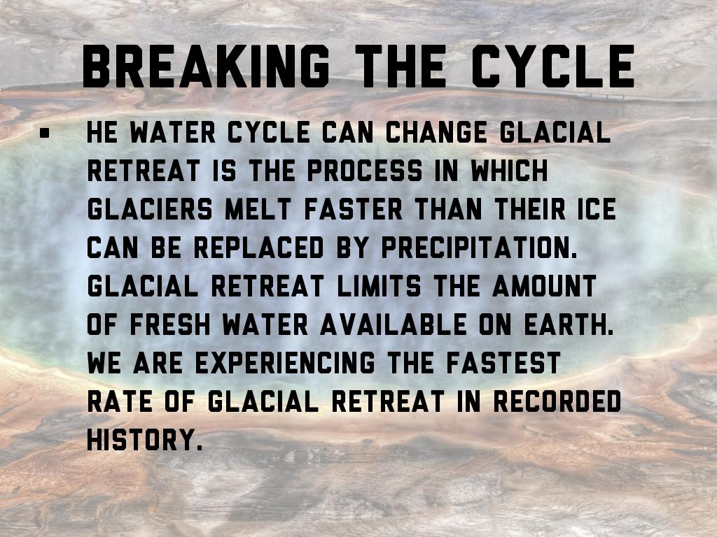 • He water cycle can change glacial retreat is the process In Which glaciers melt faster than their ice can be replaced by precipitation. Glacial retreat limits the amount of fresh water available on Earth. We are experiencing the fastest rate of glacial retreat in recorded history.