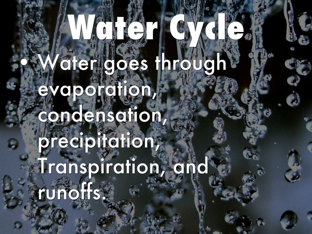 Water goes through evaporation, condensation, precipitation, Transpiration, and runoffs.