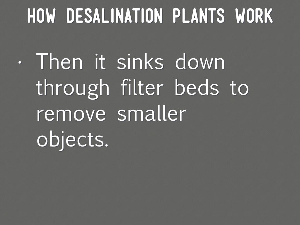 - The seawater goes through a screen to remove large objects like sand or seaweed.