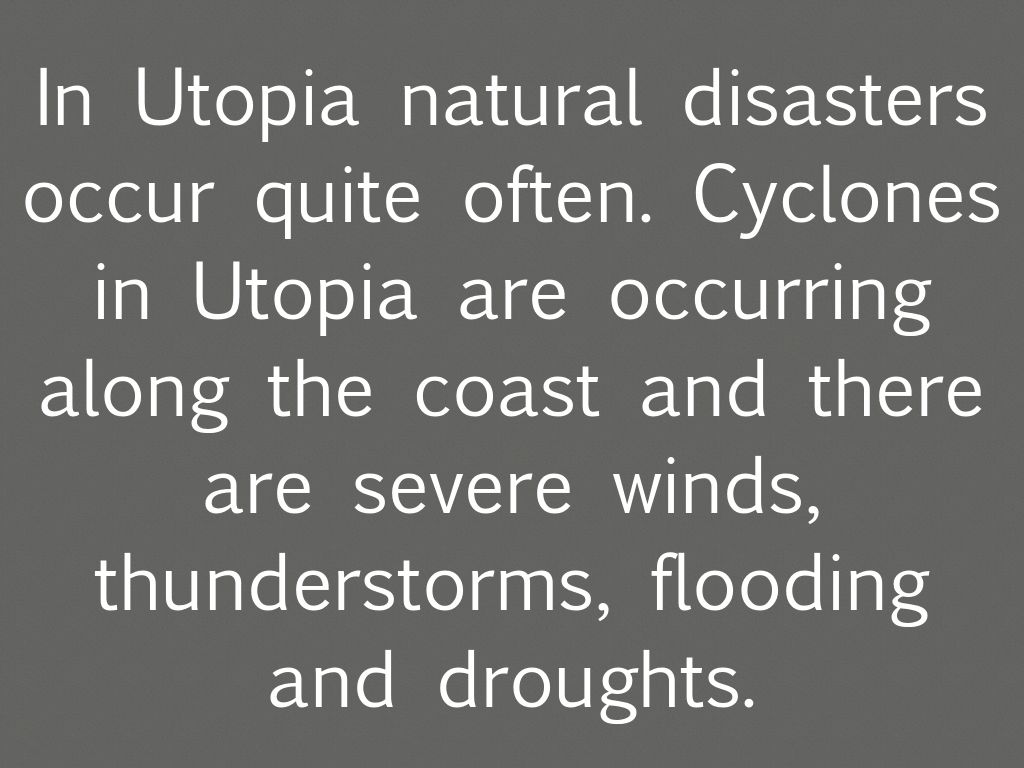 In Utopia natural disasters occur quite often. Cyclones in Utopia are occurring along the coast and there are severe winds, thunderstorms, flooding and droughts.