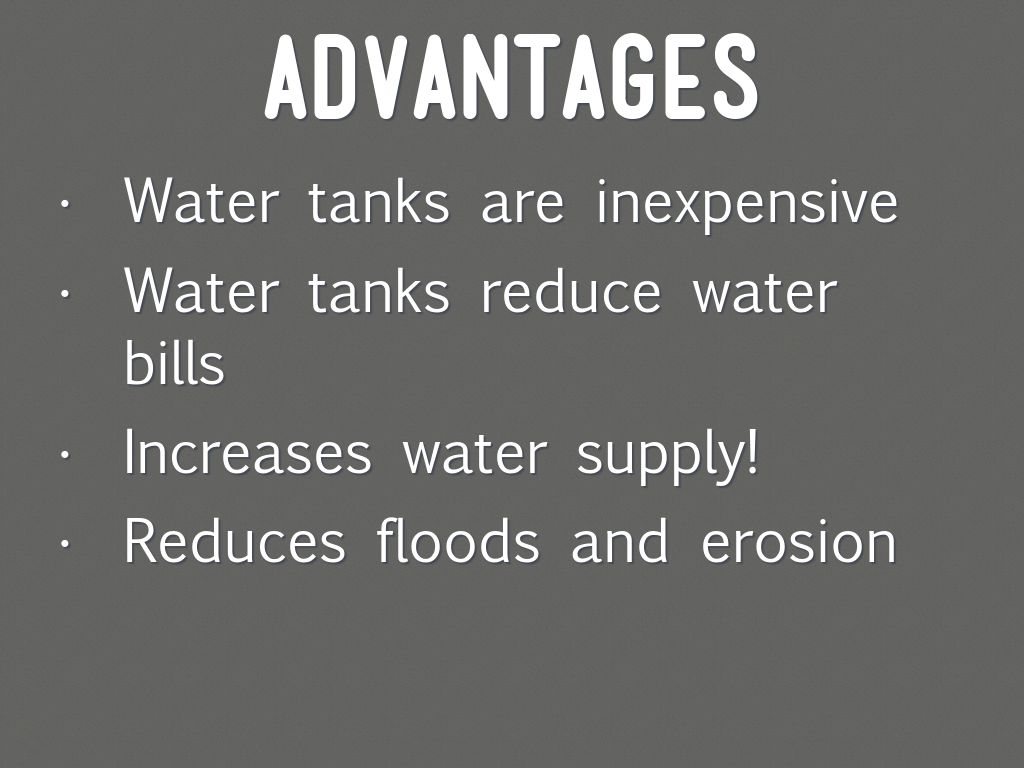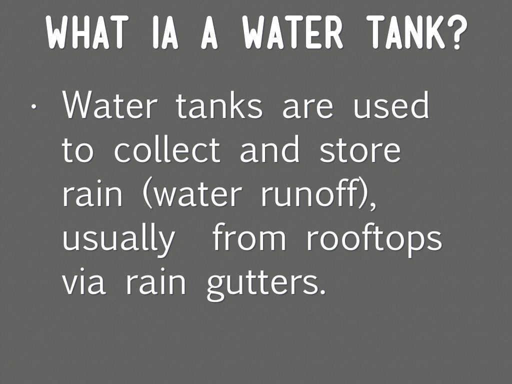 - Water tanks are used to collect and store rain (water runoff), usually from rooftops via rain gutters.
