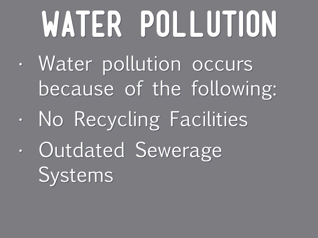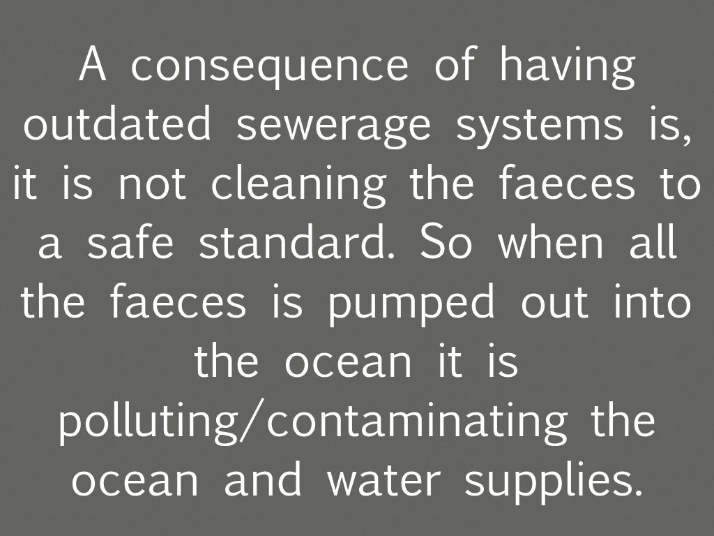 A consequence of having outdated sewerage systems is, it is not cleaning the faeces to a safe standard. So when all the faeces is pumped out into the ocean it is polluting/contaminating the ocean and water supplies.