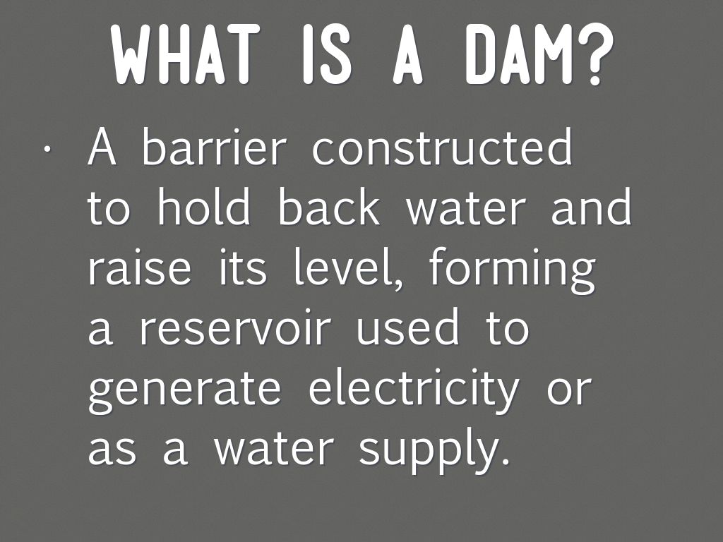 - A barrier constructed to hold back water and raise its level, forming a reservoir used to generate electricity or as a water supply.
