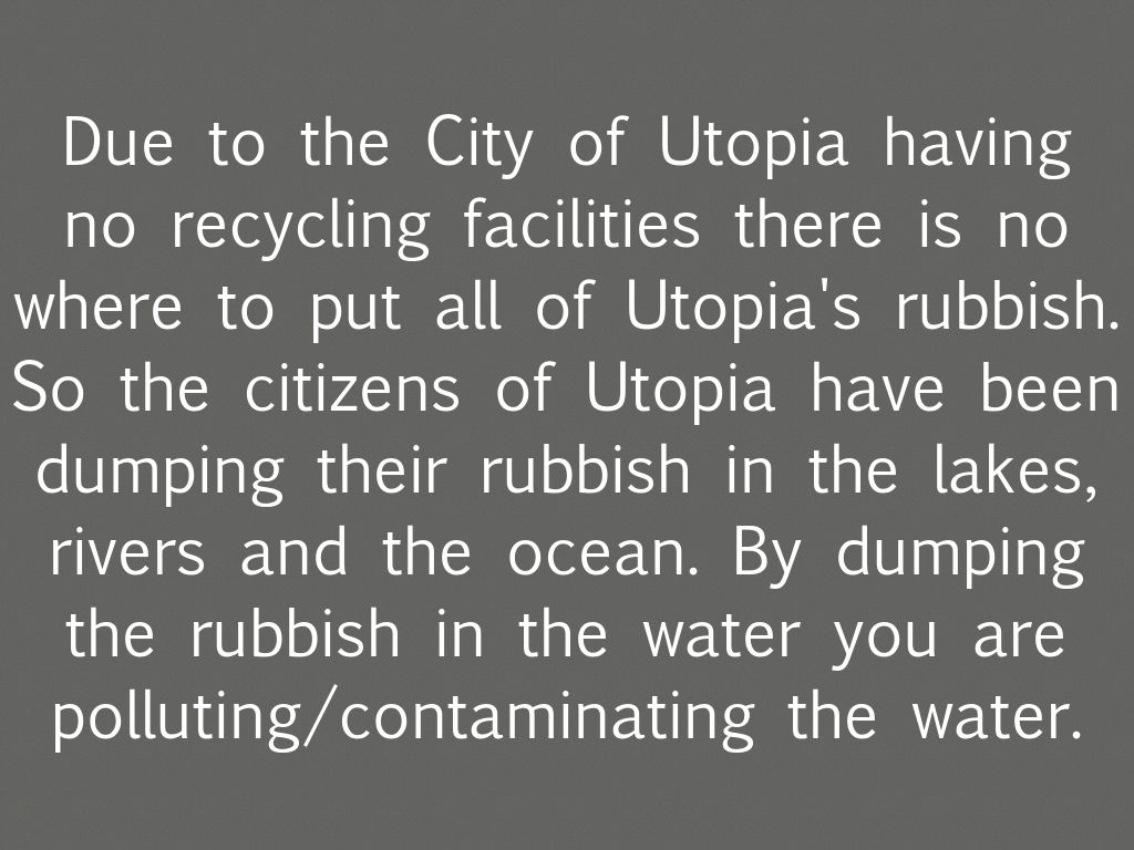 Due to the City of Utopia having no recycling facilities there is no where to put all of Utopia's rubbish. So the citizens of Utopia have been dumping their rubbish in the lakes, rivers and the ocean. By dumping the rubbish in the water you are polluting/contaminating the water.