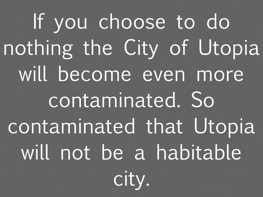 If you choose to do nothing the City of Utopia will become even more contaminated. So contaminated that Utopia will not be a habitable city.