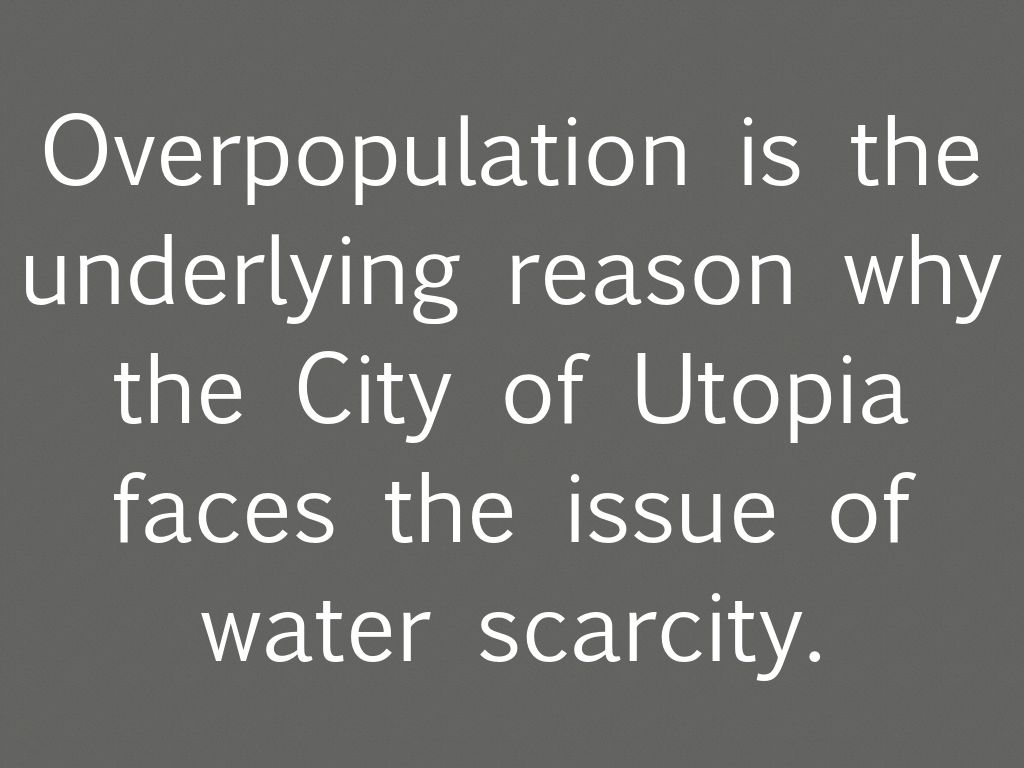 Overpopulation is the underlying reason why the City of Utopia faces the issue of water scarcity.