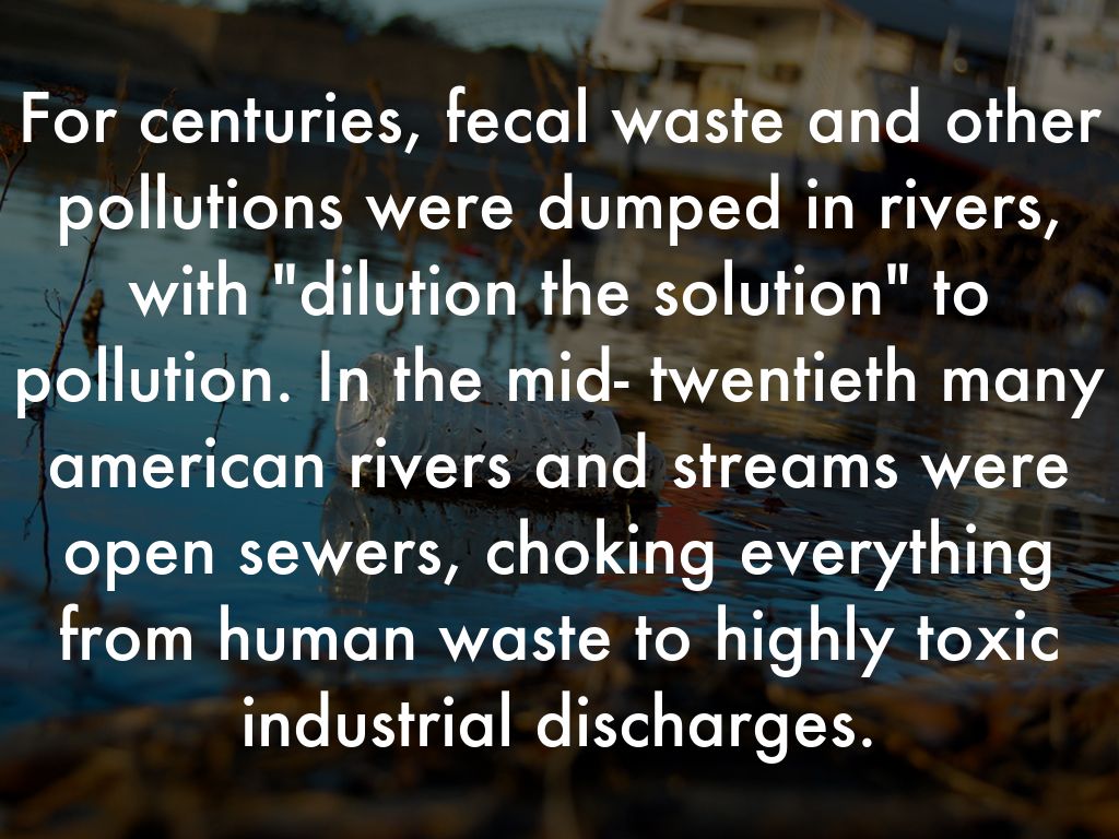 For centuries, fecal waste and other pollutions were dumped in rivers, with "dilution the solution" to pollution. In the mid- twentieth many american rivers and streams were open sewers, choking everything from human waste to highly toxic industrial discharges.