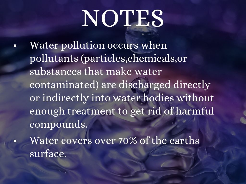 Water pollution occurs when pollutants (particles,chemicals,or substances that make water contaminated) are discharged directly or indirectly into water bodies without enough treatment to get rid of harmful compounds.