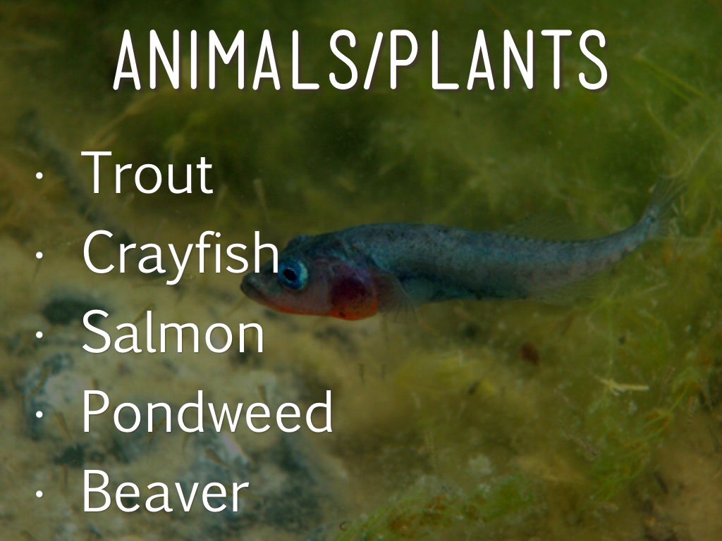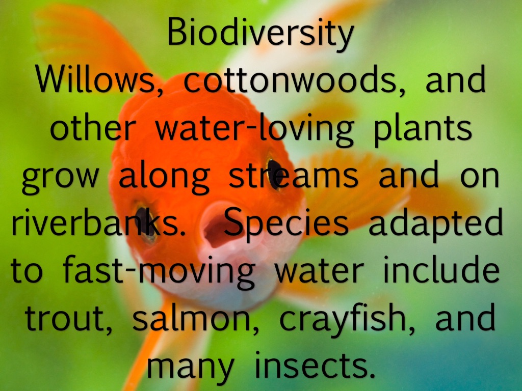 Willows, cottonwoods, and other water-loving plants grow along streams and on riverbanks. Species adapted to fast-moving water include trout, salmon, crayfish, and many insects.