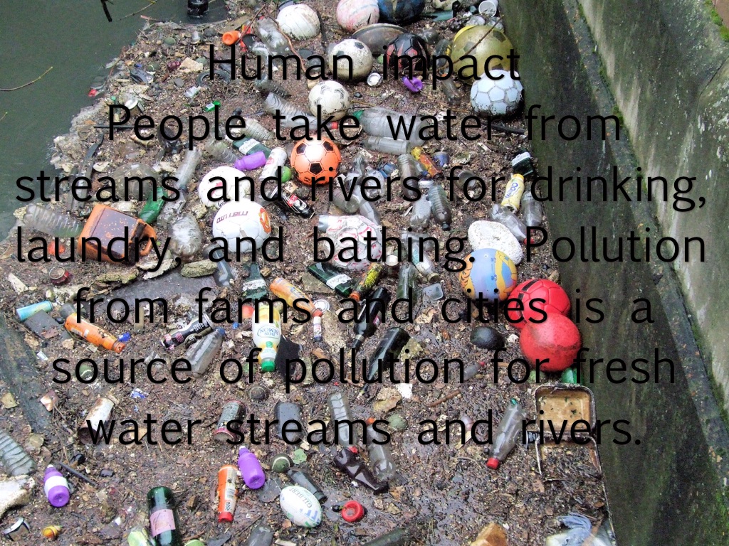 People take water from streams and rivers for drinking, laundry, and bathing. Pollution from farms and cities is a source of pollution for fresh water streams and rivers.