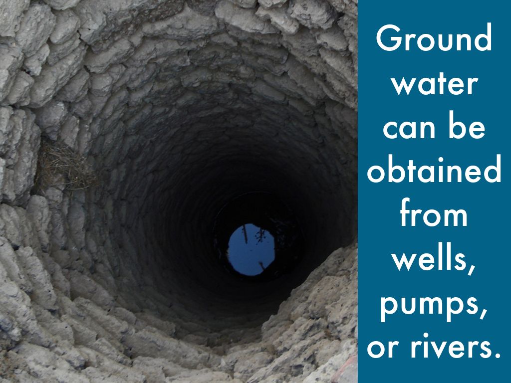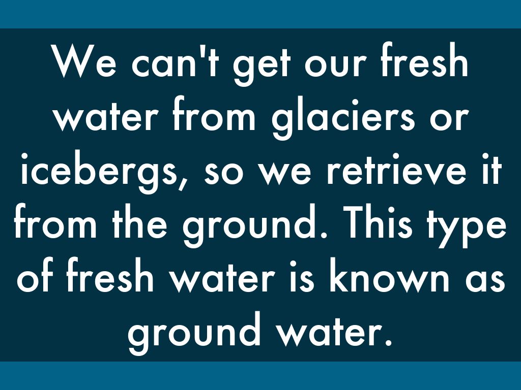 We can't get our fresh water from glaciers or icebergs, so we retrieve it from the ground. This type of fresh water is known as ground water.